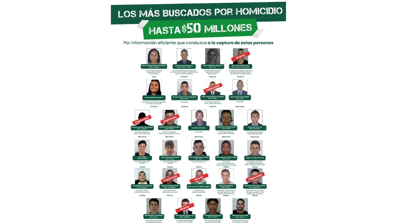 La Gobernación de Antioquia presentó el cartel de los más buscados por homicidio en el departamento, en una estrategia conjunta con la Policía Nacional para golpear estructuras criminales y delitos de alto impacto. El listado incluye 27 personas con orden de captura vigente por crímenes como homicidio, feminicidio, tortura, porte ilegal de armas y concierto para delinquir. Las autoridades anunciaron recompensas de hasta 50 millones de pesos por información que permita ubicar y capturar a los señalados. Tras la divulgación del cartel en redes sociales, los organismos de seguridad reportaron resultados operativos inmediatos con nuevas detenciones y ubicaciones de sospechosos en distintas subregiones.
