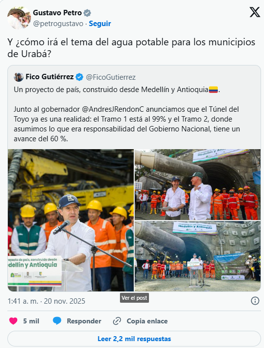 El alcalde de Medellín y el gobernador de Antioquia recibieron un cuestionamiento después de publicar los avances del la vía al Mar, el presidente Petro escribió en X: “¿Y cómo irá el tema del agua potable para los municipios de Urabá?”, el reclamo llamó la atención por una razón evidente el alcalde de Medellín no tiene ninguna competencia sobre el acueducto regional de Urabá. Ese proyecto, además, fue una promesa explícita del propio Petro en marzo de 2024, cuando en un encuentro comunitario aseguró que su Gobierno sacaría adelante la obra que garantizaría agua potable para los municipios de la región bananera.